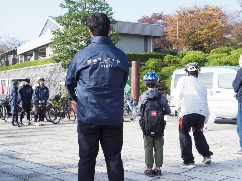 鯖江市の中央に位置する西山公園に集まったのは、シニア世代のロードバイク愛好者から小学生の親子やお孫さん連れまで幅広い年代の参加者は定員いっぱいの30名。世代を超えたコミュニケーションが取れるのもポタリングの良さかもしれません。最初に、主催者側からのこのイベントの趣旨やお願い事項についてのお話があり、その後、吉村準教授からは自転車での走行について注意して欲しいこ とについての説明を受けました。
