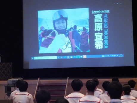 ― 高原選手は、高校2、3年生のときに私が担任をした本校の卒業生です。高校時代はスキー部に所属しながらスノーボード競技に取り組み、高校3年生のときにユースオリンピック日本代表となり、5位入賞を果たしています。学業面でも優秀な成績を修めており、メリハリのある生活をしているという印象を持っていました。大学進学後もスノーボードを続け、ついに福井県出身として初の冬季オリンピック日本代表に選出されました。高原君は「俺は将来必ずオリンピックに出ます。」と周りにはっきりと言っていました。そして、その目標のためにしっかりと行動できる生徒でした。今日は先輩のお話をしっかり聞いて色々質問してみてください。-