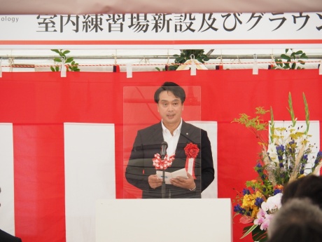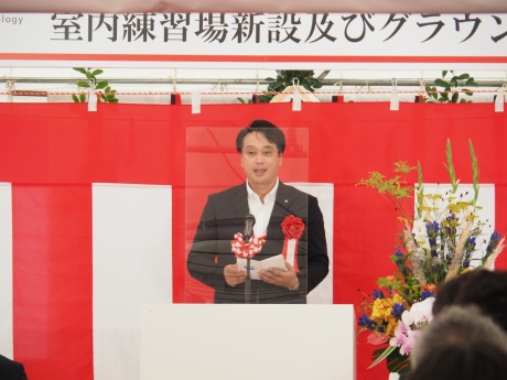 来賓を代表して河合永平寺町長からご挨拶いただきました。河合町長はカール・マイヤーグラウンド室内練習場及びグラウンド改修竣工のお祝いを述べられました。今回の改修による練習環境の整備が福井工業大学硬式野球部をはじめとした各校の野球部のさらなる活躍につながることを願うとともに、昨年11月に町内3中学校の野球部を対象とした野球教室開催への謝意を述べ、挨拶を閉じられました。
