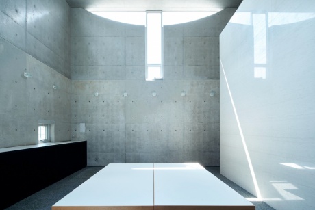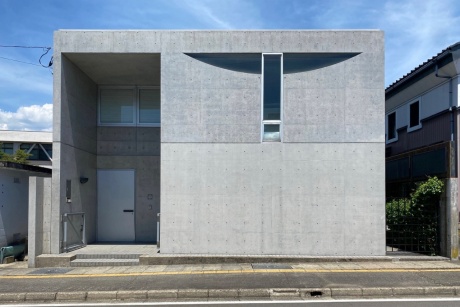 勝山には磯崎新設計の住宅が2棟あります。1983年に建てられた中上邸は磯崎新が設計した住宅シリーズの特徴であるヴォールト屋根が用いられ、多くの建築メディアに発表されています。今回リノベーションした住宅は未発表ではありますが、厳密な1050グリッドに基づいたコンクリート打放しの躯体が特徴的です。立方体の中に球体を内包したかのような抽象的で荒々しくも豊かさを感じる内部空間の表現にも、磯崎新による建築の特徴が多く見受けられます。