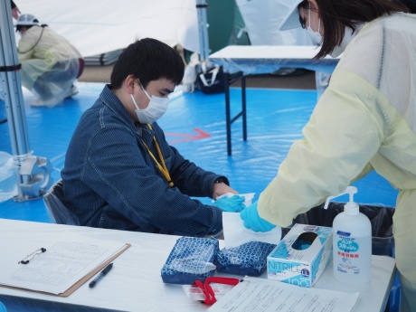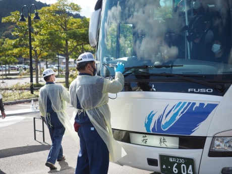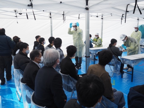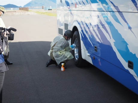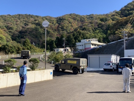 学生たちは岬地区にある若狭町漁村体験施設みさきちから避難するという想定状況で訓練に参加しました。当初は大型ヘリコプターで避難する予定でしたが悪天候のため、急遽陸上自衛隊の特殊車両3台に分乗して避難場所へ出発。途中でバスに乗り換え、おおい町のうみんぴあ大飯に仮設されたスクリーニング検査会場に向かいました。バスの放射能汚染検査や除染がおこなわれた後、降車。学生は一人ずつGMサーベイメータによるスクリーニング検査を受け、ランダムで選ばれた学生数名は簡易除染を受けていました。