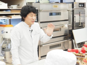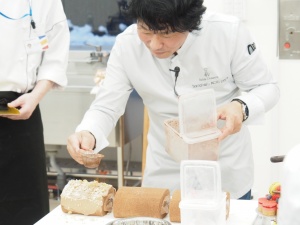 笑顔で登場した青木氏はジョークを交えた明るい口調で、学生たちの緊張を解きほぐしていきました。その後、ブッシュ・ド・ノエルとスペキュレス(香辛料を混ぜたベルギーの焼き菓子)を実際に作りながら、世界で活躍するパティシエの知識と技術を惜しみなく披露して下さいました。「チョコは温度が大切」「(チョコと生クリームを混ぜる際は)絶対に空気を入れないようにね」などと解説。理論と経験に裏打ちされた技術を目の前にして学生たちは真剣な表情でした。