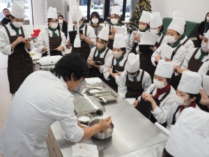 令和4年12月19日 世界的に活躍されているパティシエで本校の特別講師である青木定治氏が来校され、デモンストレーションをおこないました。青木氏のデモンストレーションは昨年度に引き続き2回目の開催です。