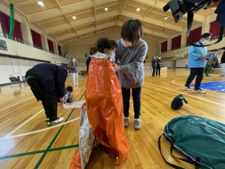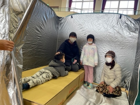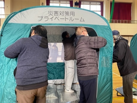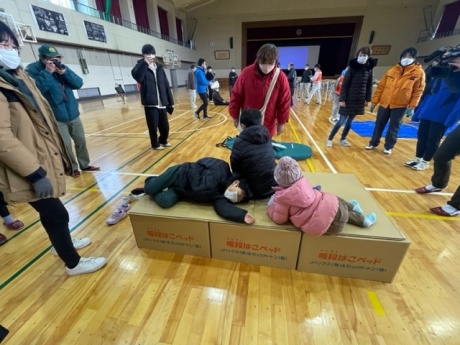 避難所開設訓練では、テントやダンボールベッド、簡易トイレを組み立てました。参加した地域住民の方からは「底冷えする体育館では、床に座ったり寝たりすることは到底できないことが実感できた。防寒シートなどを普段から備蓄する重要性がわかった」「子供でも簡単に組み立てられるベッドはありがたい」という意見がありました。