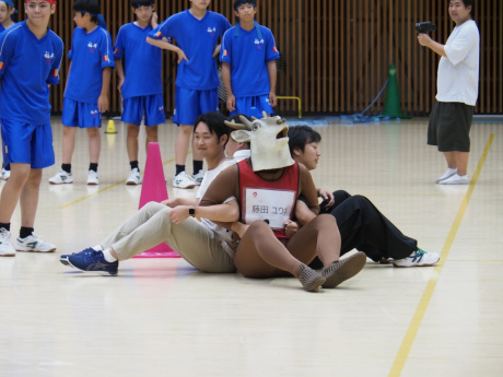 9月6日(水)におこなわれた体育祭には大学生とバンビーノの石山タオルさん・藤田ユウキさん、ミサイルマン・西代洋さんも参加し、競技説明や実況、運営補助をおこないました。お笑い芸人によるお笑い要素満載のMCに、中学生たちはもちろん見学されていた保護者さんたちも大いに盛り上がりました。