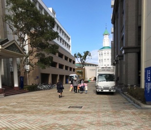 午後は落ち葉拾いを楽しむ様子が見られました。お友達ととても楽しそうに、きれいな落ち葉探しをしていました。 学園を歩きながら、大きな建物やバスなどを見てたくさん刺激を受けて、すくすくと育っていってほしいですね。