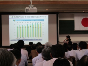 また、高校衛生看護科からは、看護師国家試験の動向と国家試験100%合格のための取組について情報提供がありました。学校・養成所数の増加や国家試験出題内容の傾向について、社会的背景を踏まえて説明されました。衛生看護科では、現在の取組に加えて、より臨床に近い実習を行うためにシミュレータ(実習教材)を多く用いたり、グループワークやゲームを効果的に取り入れた授業展開を行っていく方針が示されました。