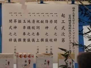 福井工業大学大学硬式野球部のホームグラウンドであるカール・マイヤーグラウンド敷地内において「室内練習場、投球練習場( 延べ約3247平方メートル) の新設、および野球グラウンド改修工事」を始めるにあたり、 令和4年1月14日(金)11:00より、 同グラウンドにて 起工式が行われました。 本学からは、学校法人金井学園 金井兼理事長をはじめ法人本部の担当者と、大学硬式野球部部長の杉浦教授、下野監督他、コーチや野球部主将などが参加して、工事期間中の安全を祈願しました。 *