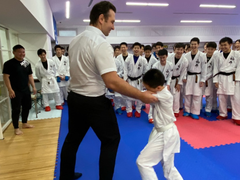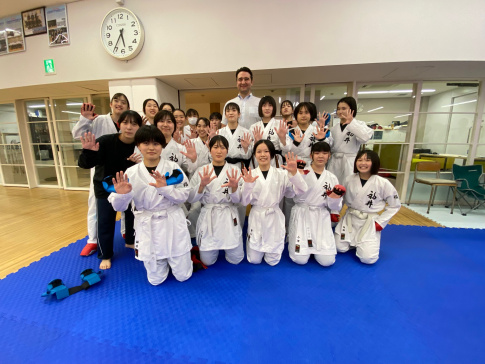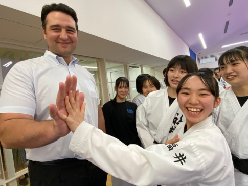 令和6年6月27日(木)に鳴門親方(元大関琴欧洲)が来校されました。 武徳殿・体育館・野球グラウンドを案内し、親方から各クラブの生徒たちに激励のお言葉をいただきました。 親方の2mを超す身長と立派な体格に、生徒たちも最初は驚いていましたが、 気さくに生徒たちに声をかけていただけるその表情には、優しい人柄がにじみ出ており、 生徒たちも手の大きさを比べたり、押し相撲対決をしたりと、楽しい思い出の時間を過ごしていました。