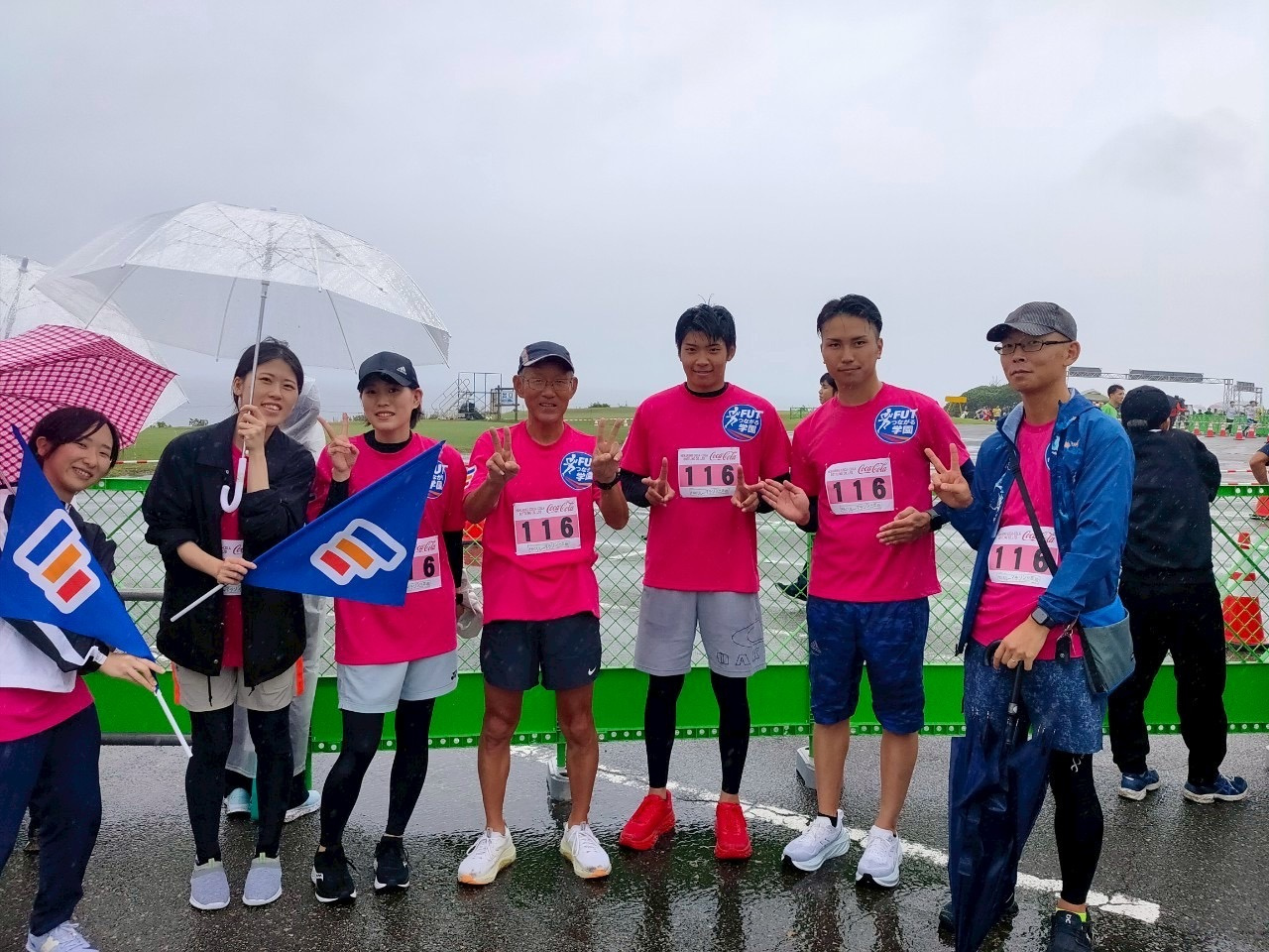 学内連携活動の促進を目的として金井学園教職員22名が、チーム名『FUT(ふっと)つながる学園』として小雨の降る中、タスキをつなげ走り抜けました。当日は、応援にかけつけてくれた教職員の温かい声援を受け、ONE TEAMで全員が無事に走りきることができました。