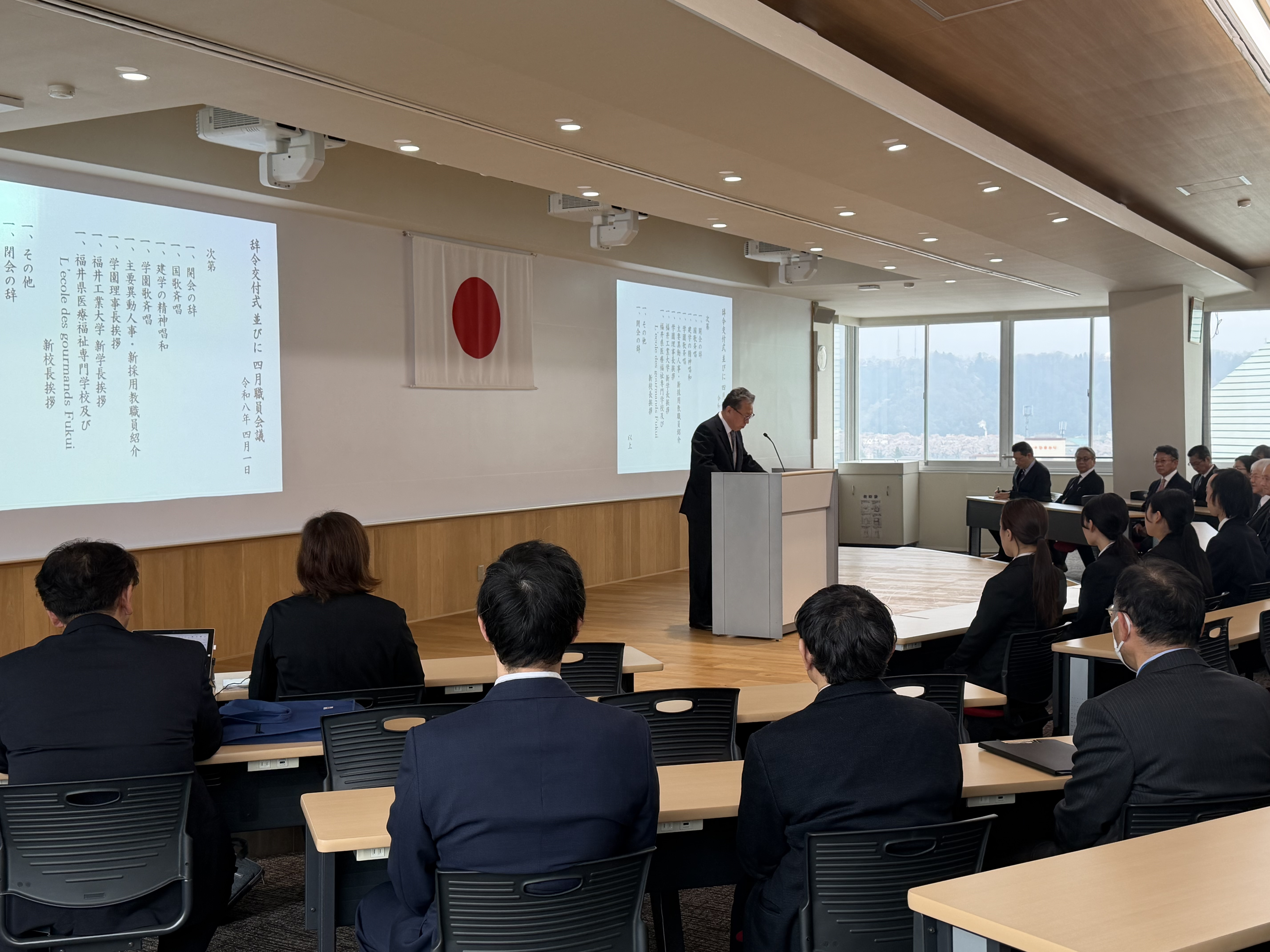 理事長挨拶の冒頭では、福井工業大学新学長、福井県医療福祉専門学校・L'ecole des gourmands Fuku新校長の就任に伴う、新体制でスタートしていく旨と、新任の教職員に向けて歓迎の言葉を述べました。