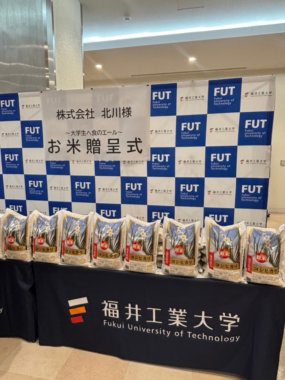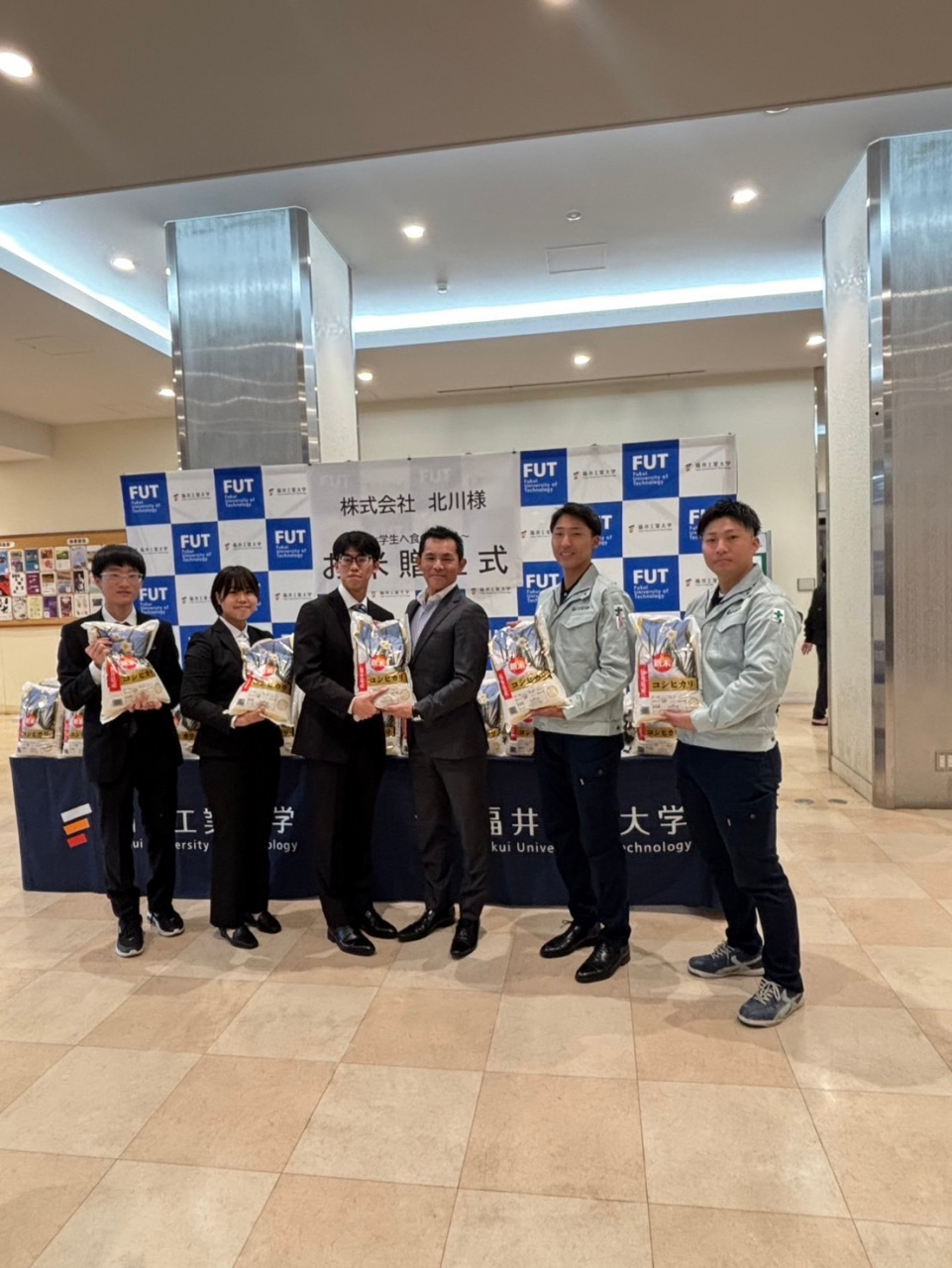 株式会社北川様より、大学生を対象に、新米(福井県産こしひかり)5kg×110袋を寄贈していただきました。