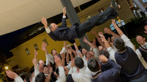 会見後は、体育館で待ち構えていた硬式野球部3年生たちから胴上げの祝福を受け、その後グラウンドに出向いて