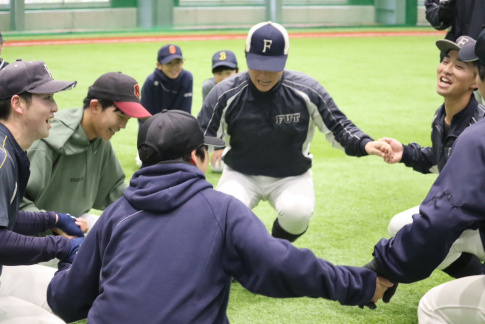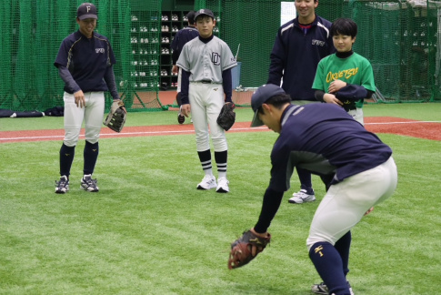 本学硬式野球部員が、12名の参加者に対して、ポジションに分かれてマンツーマンで守備や打撃に関する技術を3時間指導し、守備練習では、足の運び方やグラブの出し方など一つひとつを確認するなど、丁寧なアドバイスを行いました。