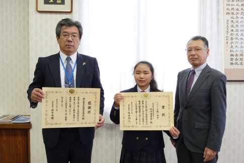 福井工業大学附属福井高等学校 1年 坪川満里奈さんが、福井税務署による「税に関する高校生の作文」にて「福井税務署長賞」を受賞し、同校の校長室において授賞式が行われました。また、福井工業大学附属福井高等学校が作文の応募を通じて租税教育に貢献したとして、金沢国税局長より佐々木校長に対し感謝状の贈呈も併せて行われ、その様子がメディアで取り上げられました。