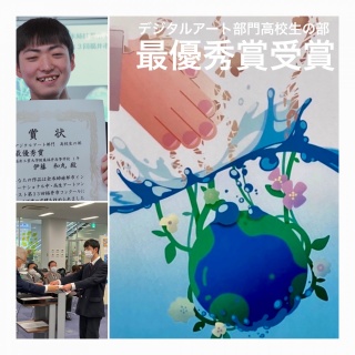 公益社団法人ふくい市民国際交流協会が主催する「全米姉妹都市インターナショナル中・高生アートコンテスト第33回福井市コンクール」において、福井高等学校進学科進学コースⅡ類デザイン分野1年の伊藤和丸さんが全作品45点の応募の中から最優秀賞(デジタルアート部門高校生の部)を受賞しました。伊藤さんの作品は、アメリカで開催される全米姉妹都市アートコンテストの本選に出展されます。(作品タイトル:What protecting the earth is your hands 干ばつや砂漠化の進む地球をそっと水に浮かべる様子がデジタルアートで描かれています)
