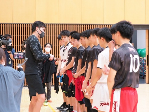新型コロナウイルスの感染拡大防止に伴い、高等学校においてインターハイ及び様々な競技大会が中止になっている中、自身の後輩である3年生男子バレーボール部員たちを少しでも励ましたいという来校のご本人から申し出を受けて実現したもので、本人も加わっての白熱した紅白戦を行ったあと、全日本チームの練習着を3年生の男女にプレゼントしていただきました。