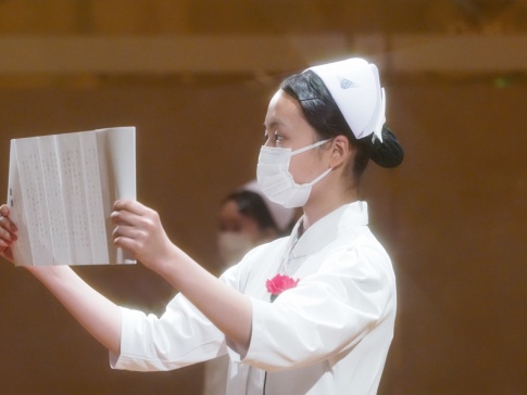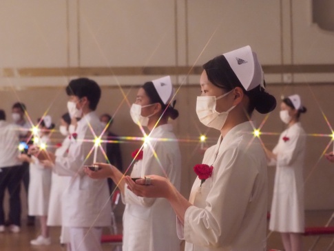 病院実習を控えた高校衛生看護科の2年生32名が、ナースキャップ(男子はポケットチーフ)を受けキャンドルを手にナイチンゲール誓詞を唱和すると、金井講堂は独特の崇高な雰囲気に包まれました。