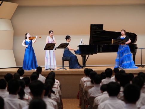 今回は、出張音楽堂の方々が演奏や歌を披露し、同校生徒がプロの音楽家の演奏や歌声に聞き入る様子がメディアに掲載されました。