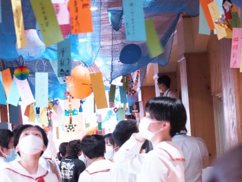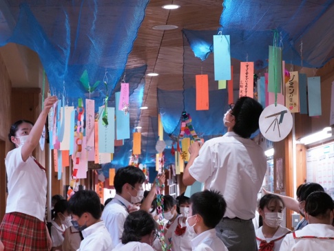令和4年6月30日(木)|本校の一・二階廊下の天井に、天の川に見立てた青いネットに、個々の目標や夢を書いた短冊や風船や折り紙などを飾り付けしました。その様子がメディアで取り上げられました。