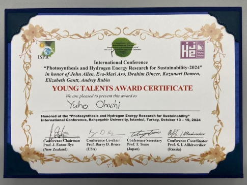 本学大学院 工学研究科 応用理工学専攻 環境生命化学コース2年の大橋 悠歩さんが、昨年10月13~19日にイスタンブールで開催された国際学術会議「持続可能性のための光合成と水素エネルギー研究2024(Photosynthesis and Hydrogen Energy Research for Sustainability – 2024)」において、若手優秀賞を受賞しました。