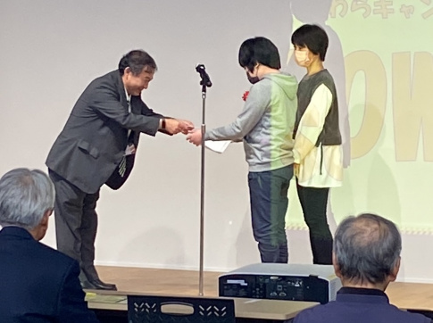 またこの日、キャンパス内に設置されているアンテナ地上局(4基のパラボラアンテナと運用室)の愛称発表および授賞式が行われました。今年8月26日~9月30日に全国の小学生から応募があった86点の中から学内選考委員会で3点に絞り、大学関係者の投票によって、福井県坂井市立兵庫小学校6年生の中山耀斗さんが発案した「SOWARA」に決定し、大賞として賞状と30,000円分のオリジナルQUOカードが手渡されました。中山さんは「とても嬉しい。あわら市の青い海・青い空・緑の大地をイメージして考えた。このあわらキャンパスが多くの人が訪れる場所になって欲しい」と大賞受賞の感想を話してくれました。また残念ながら大賞を逃した2名には特別賞として賞状とオリジナルQUOカード3,000円分が手渡されました。