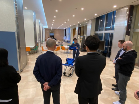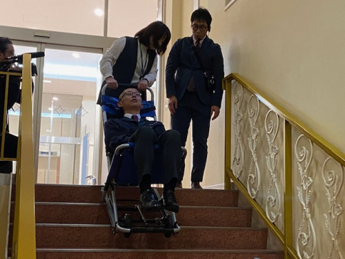 地震や火災などでエレベーターが使用できない災害時・非常時に、障がいのある方を含む要援護者やケガをされた方など歩行困難な方を上層階から階段を使用して安全・円滑・迅速に避難させることができる、セーフエバキュエーションチェアの試行会を開催し、教職員がその操作方法を体験しました。