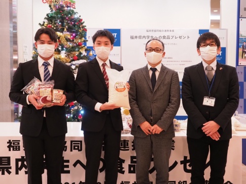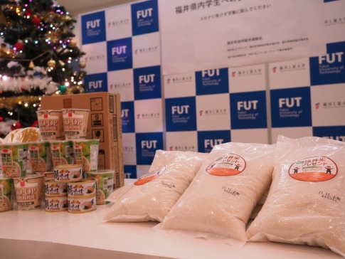 この度、福井県協同組合連絡会(福井県JAグループ、福井県漁業協同組合連合会、福井県森林組合連合会、福井県生協連合会、NPO法人ワーカーズコープ福井事業所)より、コロナ禍で厳しい生活を送っている学生に対して、お米や保存食品などを無料配布して、応援することを目的に、『食品』を寄贈したいとのお申し出を頂きました。大学を代表して、学友会の学生が「食品」を受けとりました。その寄贈式の様子がメディアからの取材を受けました。