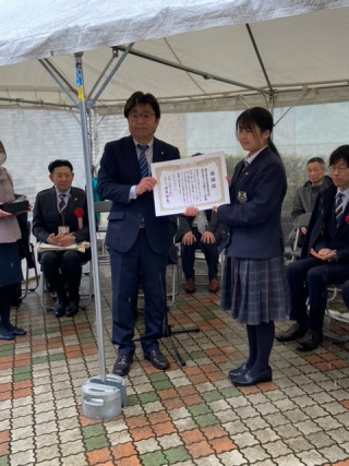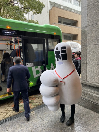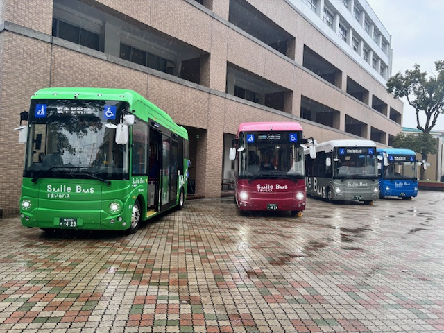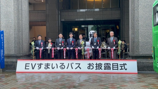 福井工業大学まちづくりデザインセンターが京福バスから依頼を受け、福井工業大学附属福井高校の生徒が考えたデザイン案を、福井工業大学の学生がブラッシュアップし作成したEVすまいるバスの新車両お披露会が行われ、西行茂福井市長・岩本裕夫京福バス株式会社代表取締役ほか多数のご来賓がお越しになりました。式典内で、デザインを担当した学生・生徒に感謝状と記念品の贈呈があり、大学応援団吹奏楽部の演奏もありました。お披露目会後には試乗会も行われました。デザインを担当した学生も試乗を楽しみ、「乗り心地がとても良く、たくさんの人が乗ることを期待している」と感想を述べていました。