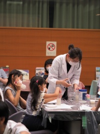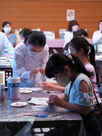当日は、大変な猛暑の一日でしたが、光エコキャラバン隊に参加した学生たちが、進行や小学生へのサポートを行い、小学生たちに簡単なものづくりを通した「環境に優しい光」についてまなぶ機会となりました。終了後には、制作したしおりやスライムを嬉しそうに出迎えたご家族にも見せている姿がとても印象的でした。