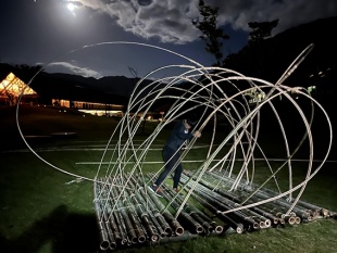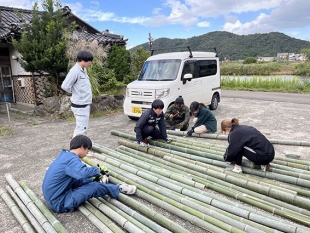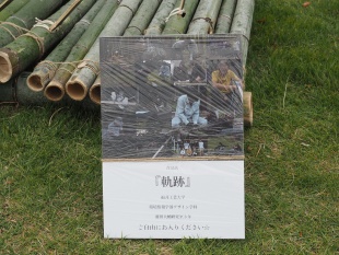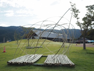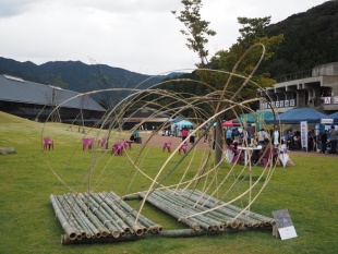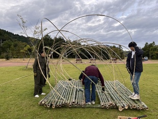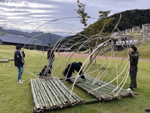 今年度は3年生6名が参加。町内で問題になっている放置竹林伐採に参加し伐採した竹を使用し、星の軌跡をモチーフにオブジェを作成しました。学生さんたちは各部材の加工を進めてゆき、若フェス前日に現地で一気に組み上げたそうです。タイトルは「軌跡」。軌跡のトンネルをくぐると年縞博物館に抜けてゆくことをイメージして制作したとのことです。